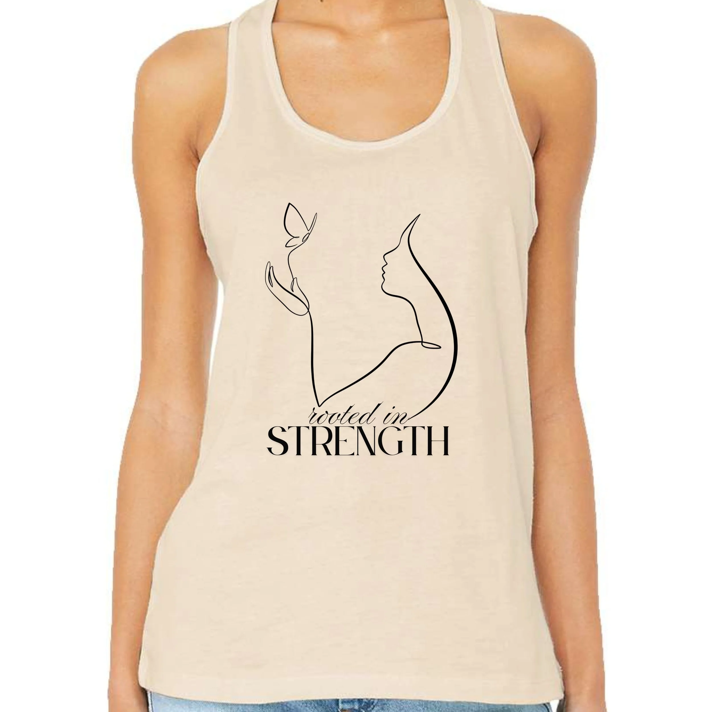 Join us in celebrating our 35 year anniversary with our limited release tank top — featuring the outline of a woman holding a butterfly. Reads “ Rooted in Strength”