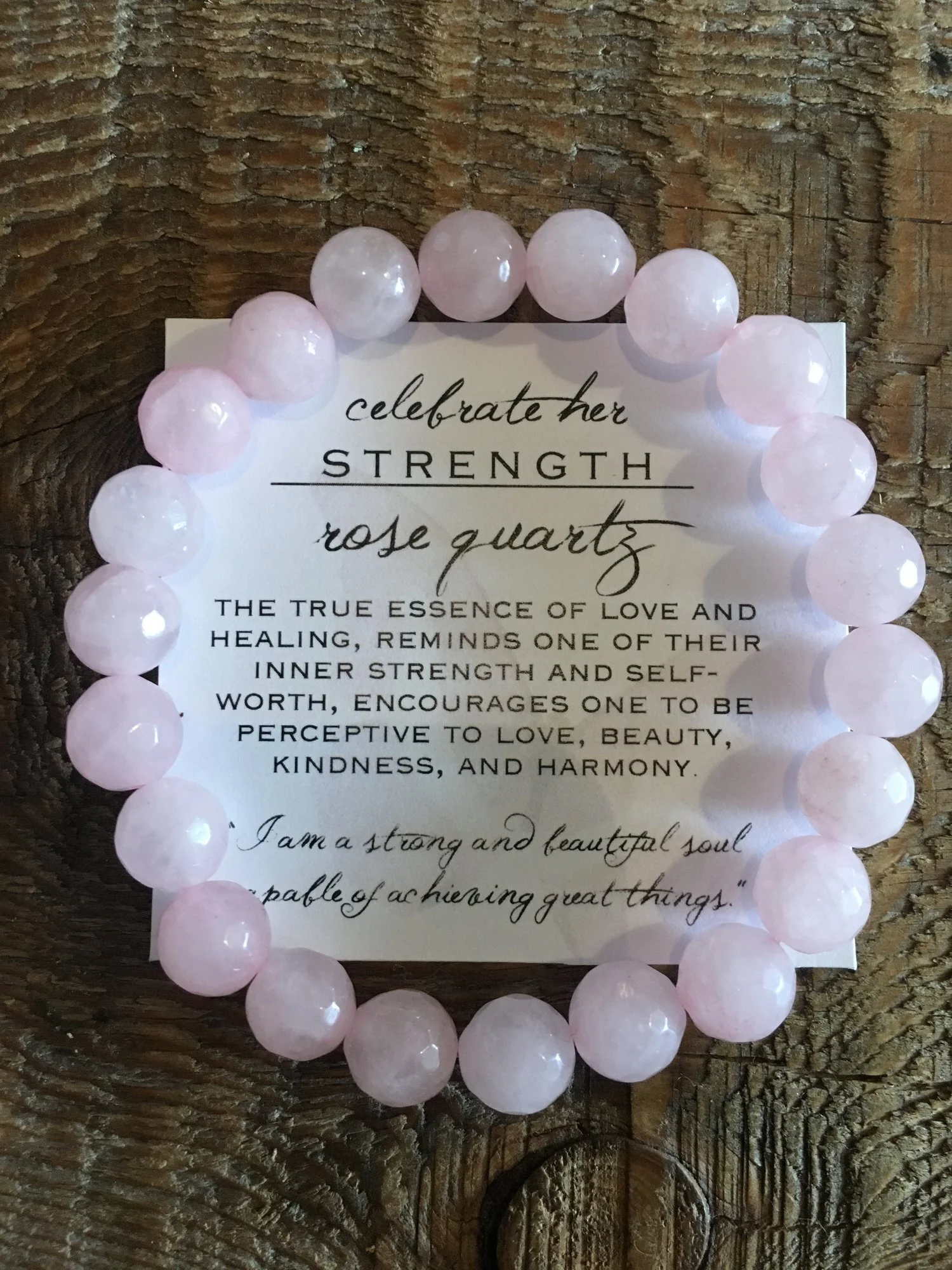 Rose quartz for Strength: the true essence of love + healing, reminds one of their inner strength + self-worth, encourages one to be perceptive to love, beauty, kindness, + harmony.