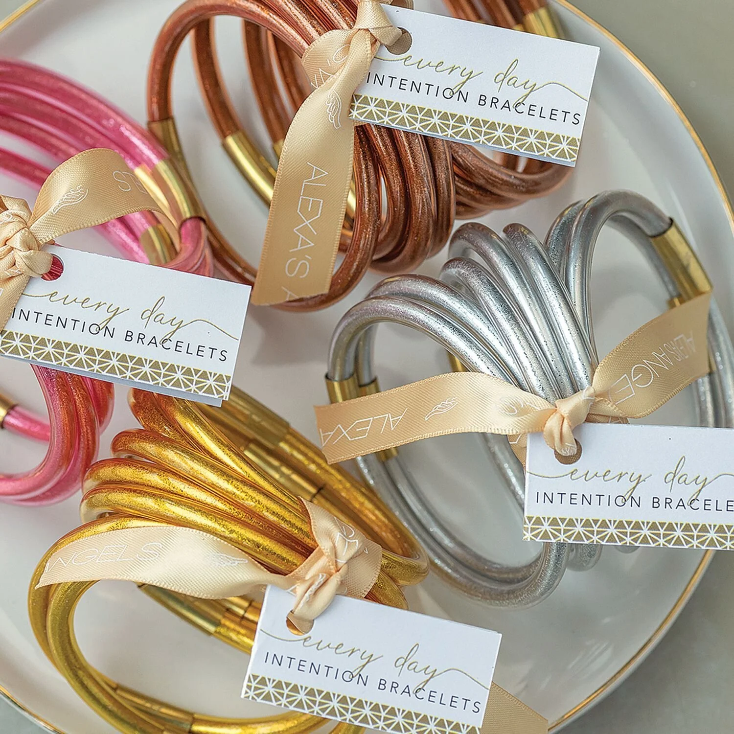 Be beautiful and mindful with these wearable reminders to set your positive intentions every day. Each of the seven bracelets has an inspiring word engraved on the gold ring...one for every day of the week. Crafted of PVC, these these bracelets are noiseless, weightless and water resistant.